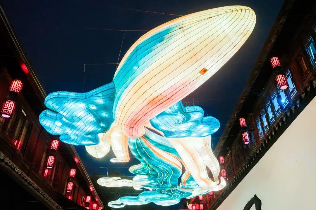 從小河直街繼續往北走1公里多,就到了這次運河燈會的核心打卡區——橋西直街和拱宸橋。這裏最不能錯過的,就是方回春堂前的巨型鯤鵬大魚燈(就是大家刷屏的那隻)。