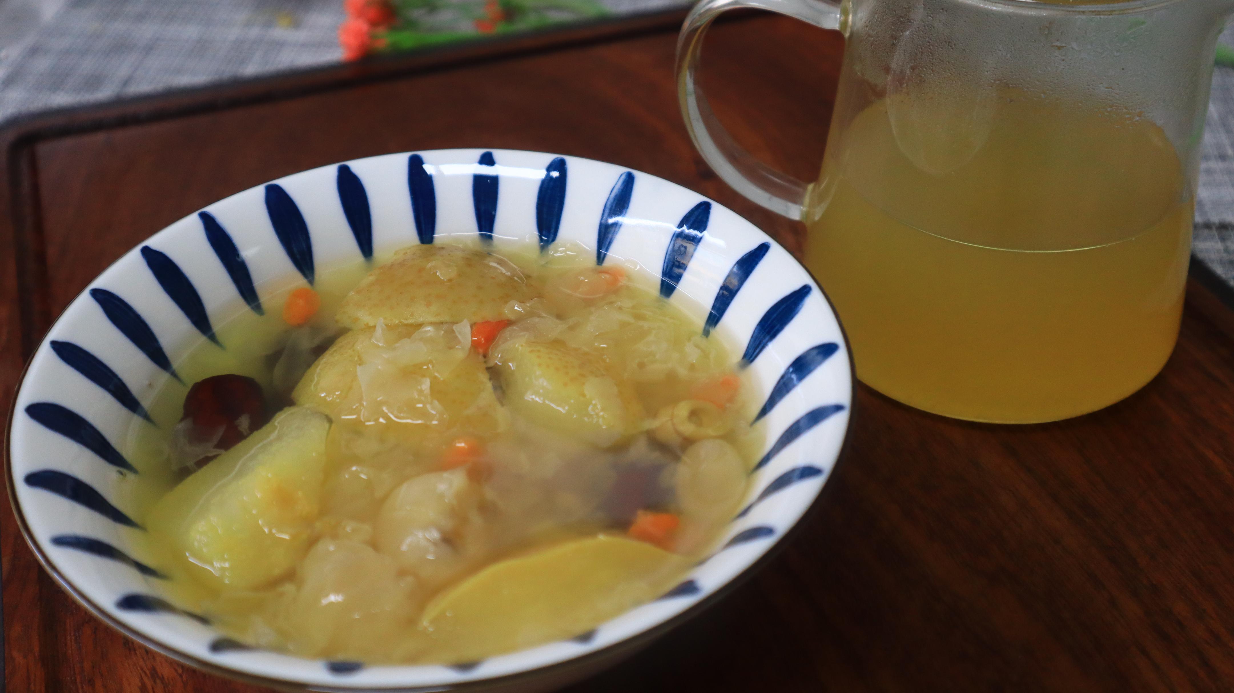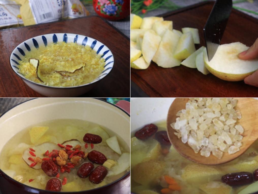 主要食材:雪花梨、幹銀耳、蘆根、百合、話梅、桂圓、枸杞、冰糖
