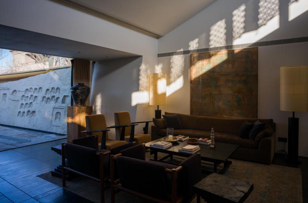 一踏入酒店大堂,最矚目的當屬落地窗外化自雲岡石窟的無相庭。