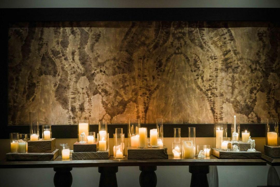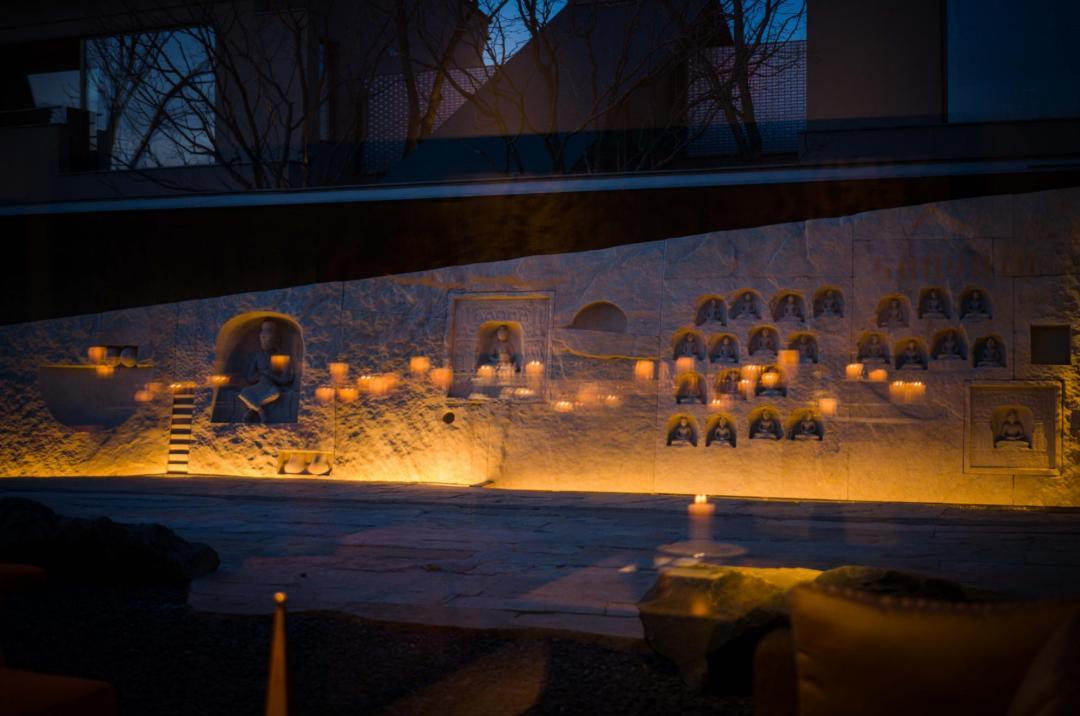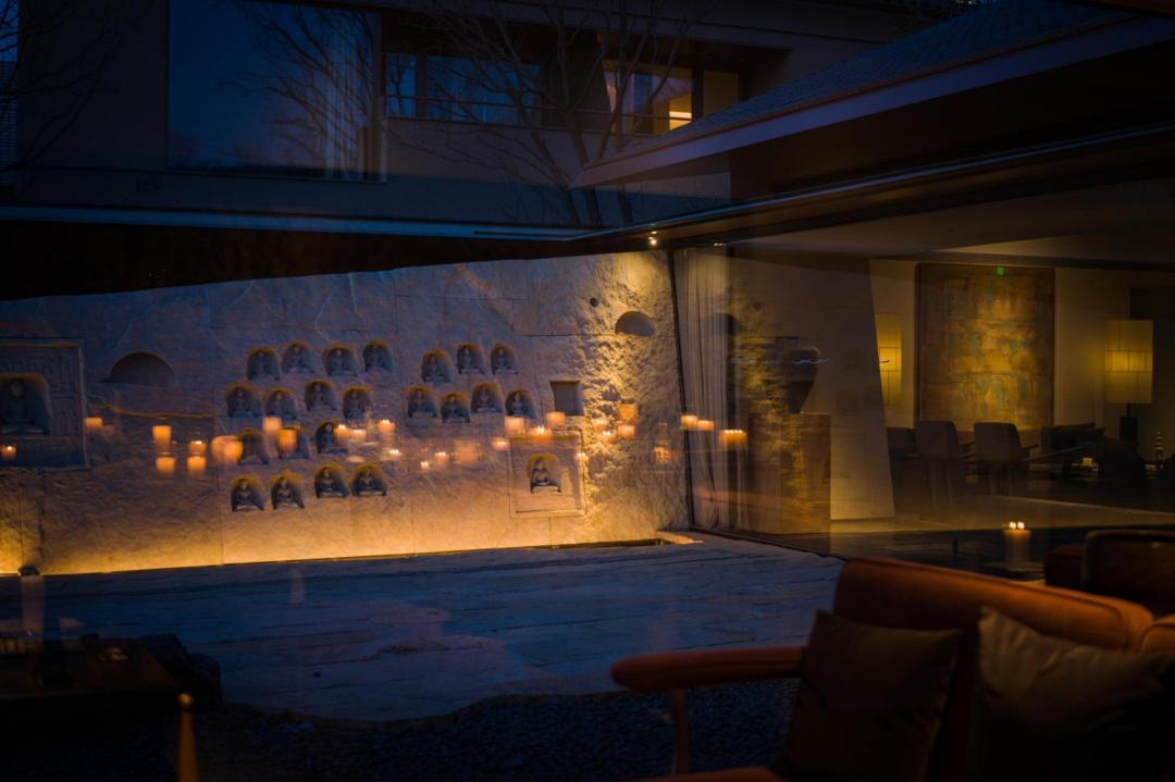 最神性的當屬夜晚的掌燈時刻。室內燭臺燃起,燭火在玻璃鏡上搖曳,佛影朦朧,萬千光華。