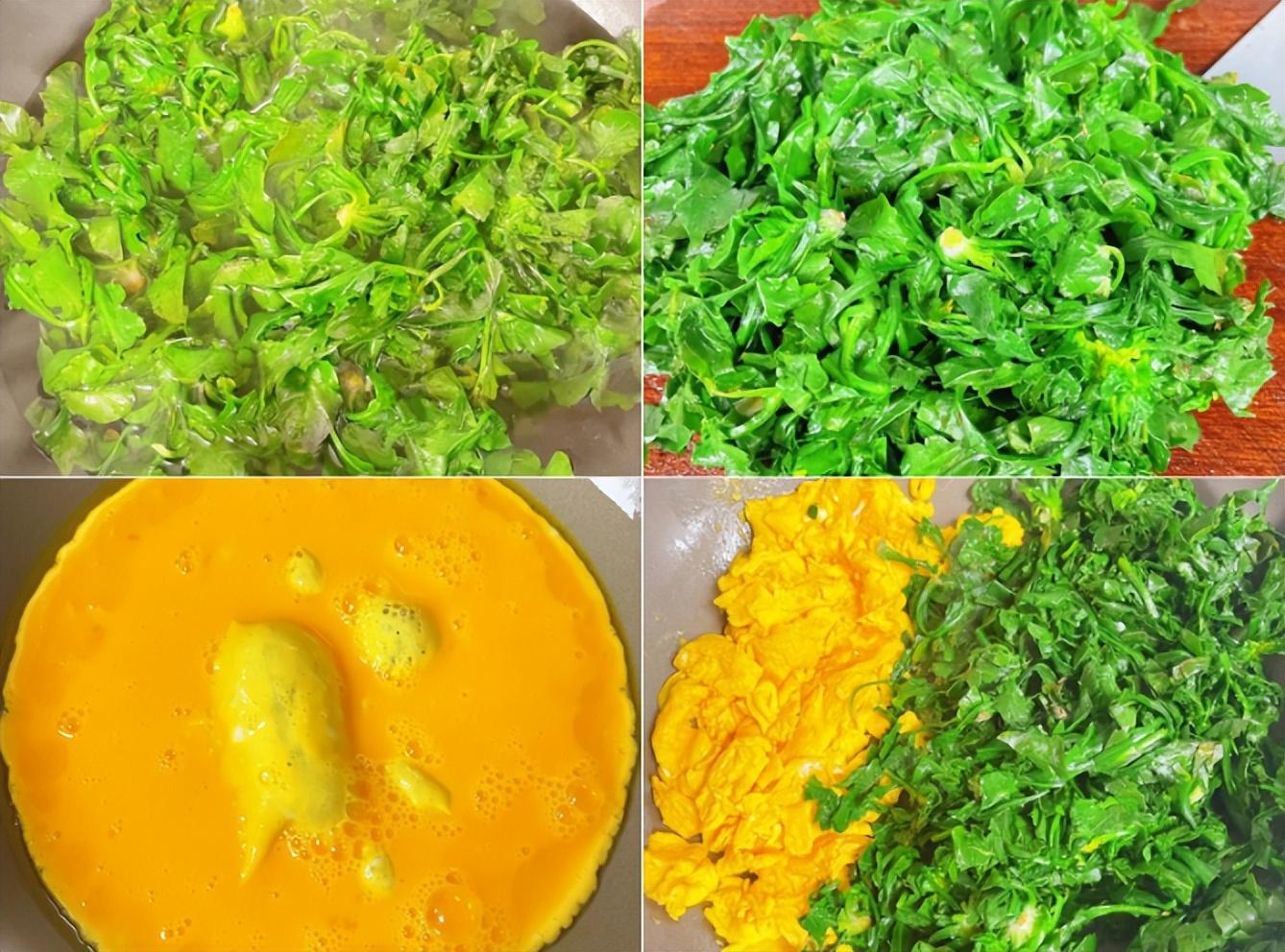 3、起鍋燒油,油熱倒入雞蛋 ,雞蛋定型,撥在一邊,加入薺菜 。