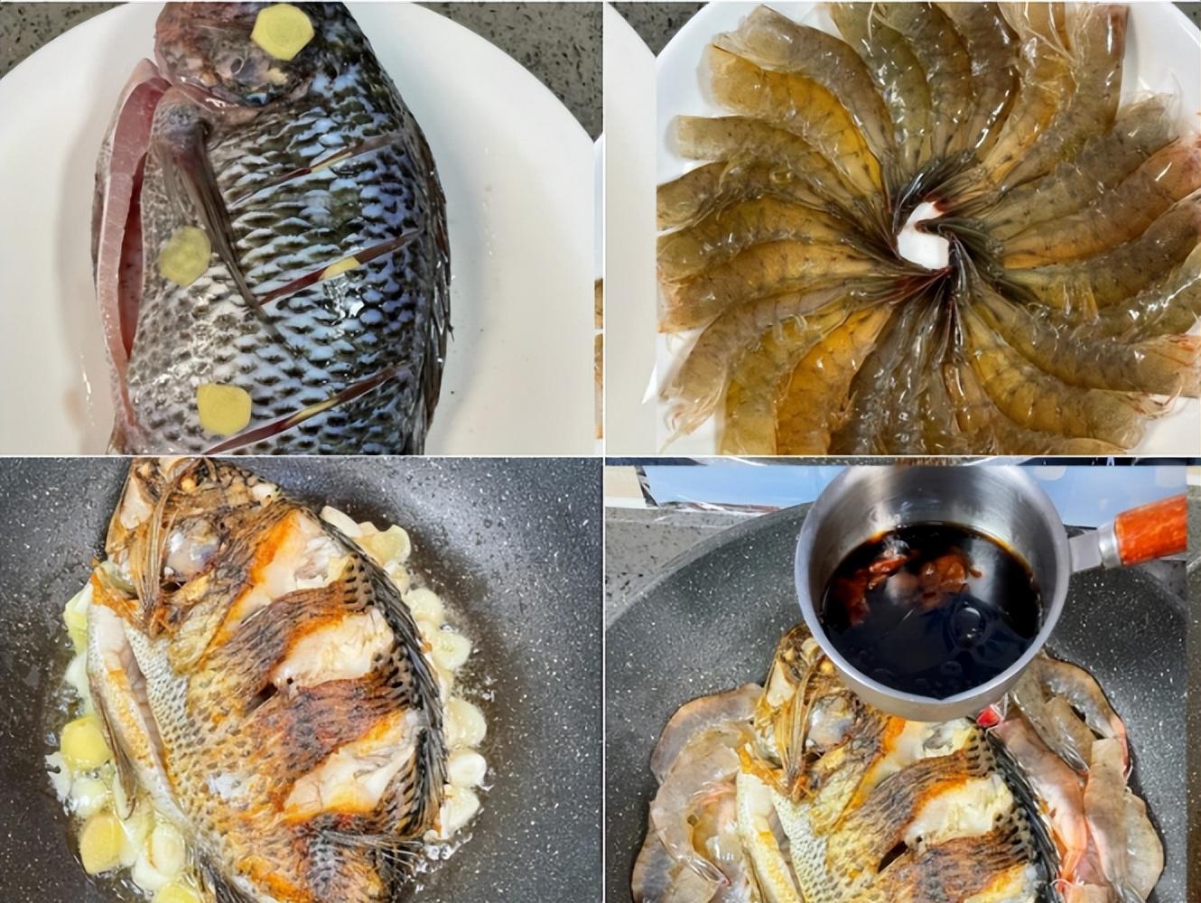 1、羅非魚洗淨劃刀,加鹽、薑片、料酒抹勻魚身,醃製20分鐘,大蝦剪蝦頭、挑蝦線後洗淨。