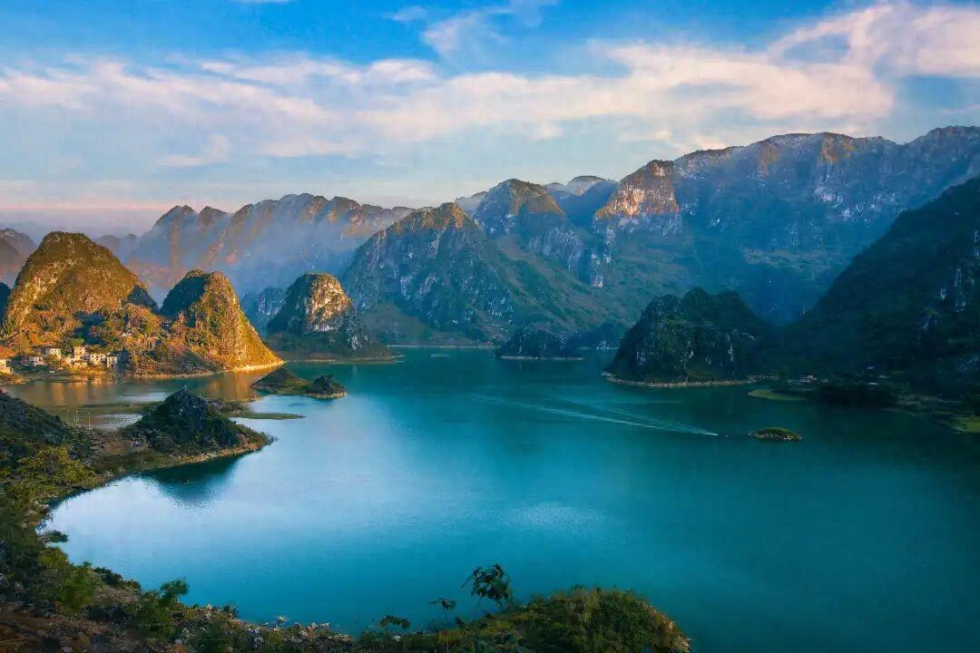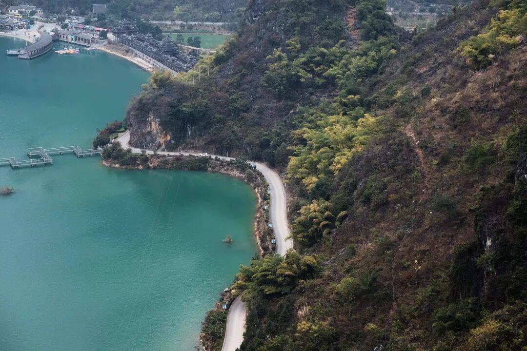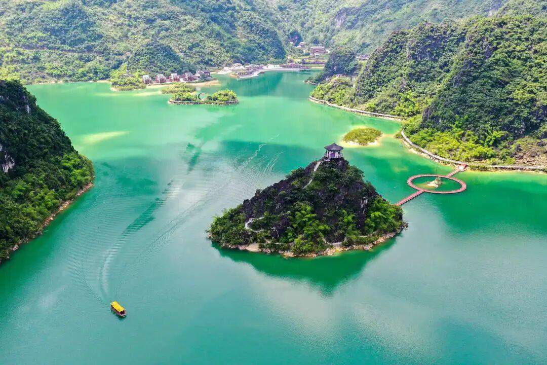 這座高原喀斯特湖泊,被數十座錐狀峯林溫柔環抱,湖水常年呈翡翠般的藍綠色。20平方公里的湖面,形成了微氣候環境,時而云霧環繞,時而撥雲見日。