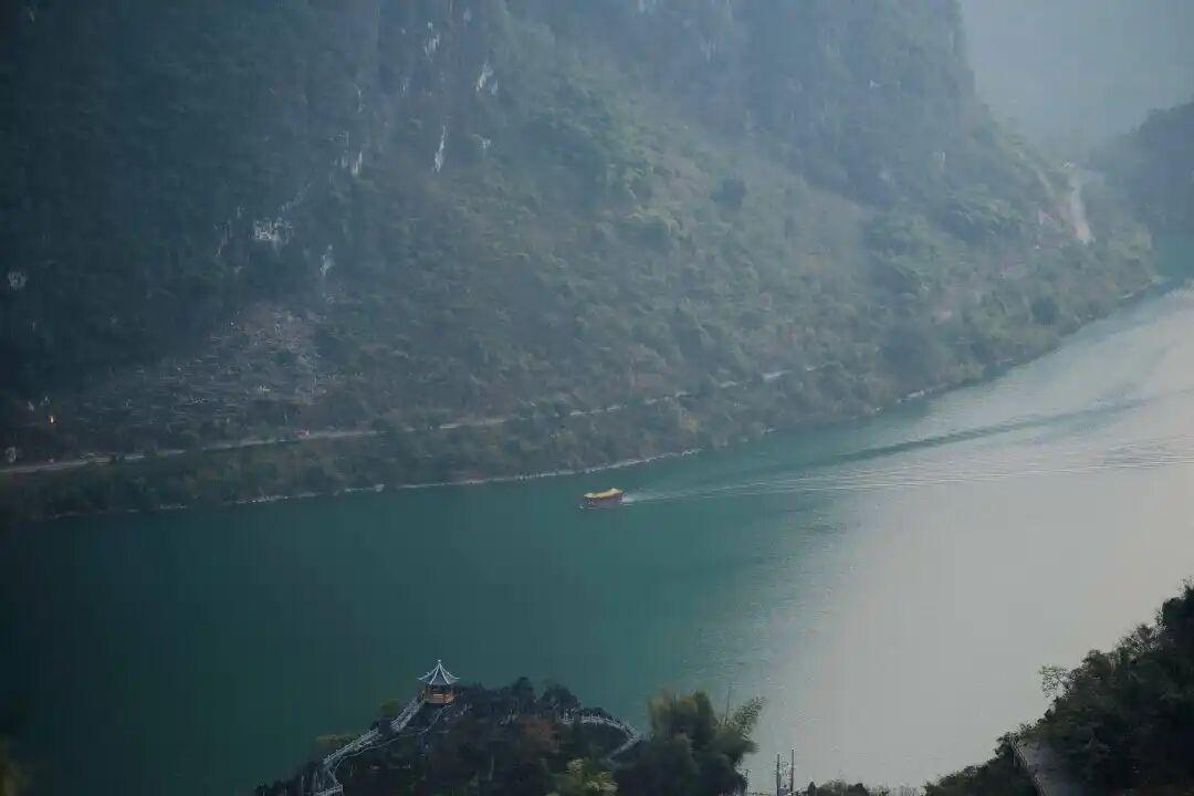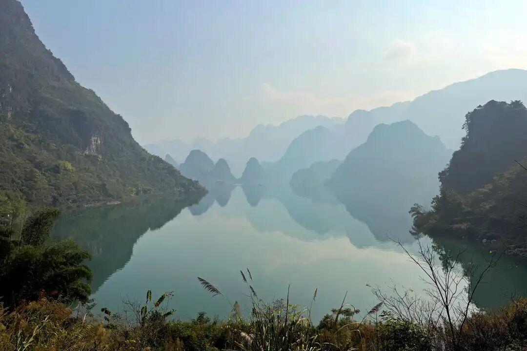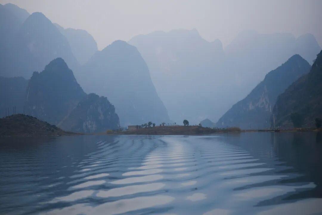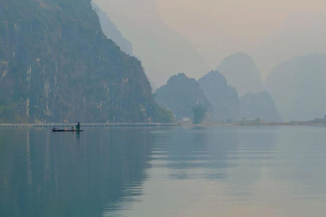在晨霧裏乘竹筏遊湖,一切煩惱消散無蹤,眼前只有山風拂過湖面的漣漪,峯林倒映水中的靜謐,以及湖邊人家的煙火氣。峯林如黛,湖水如翡,宛如一幅流動的水墨長卷。