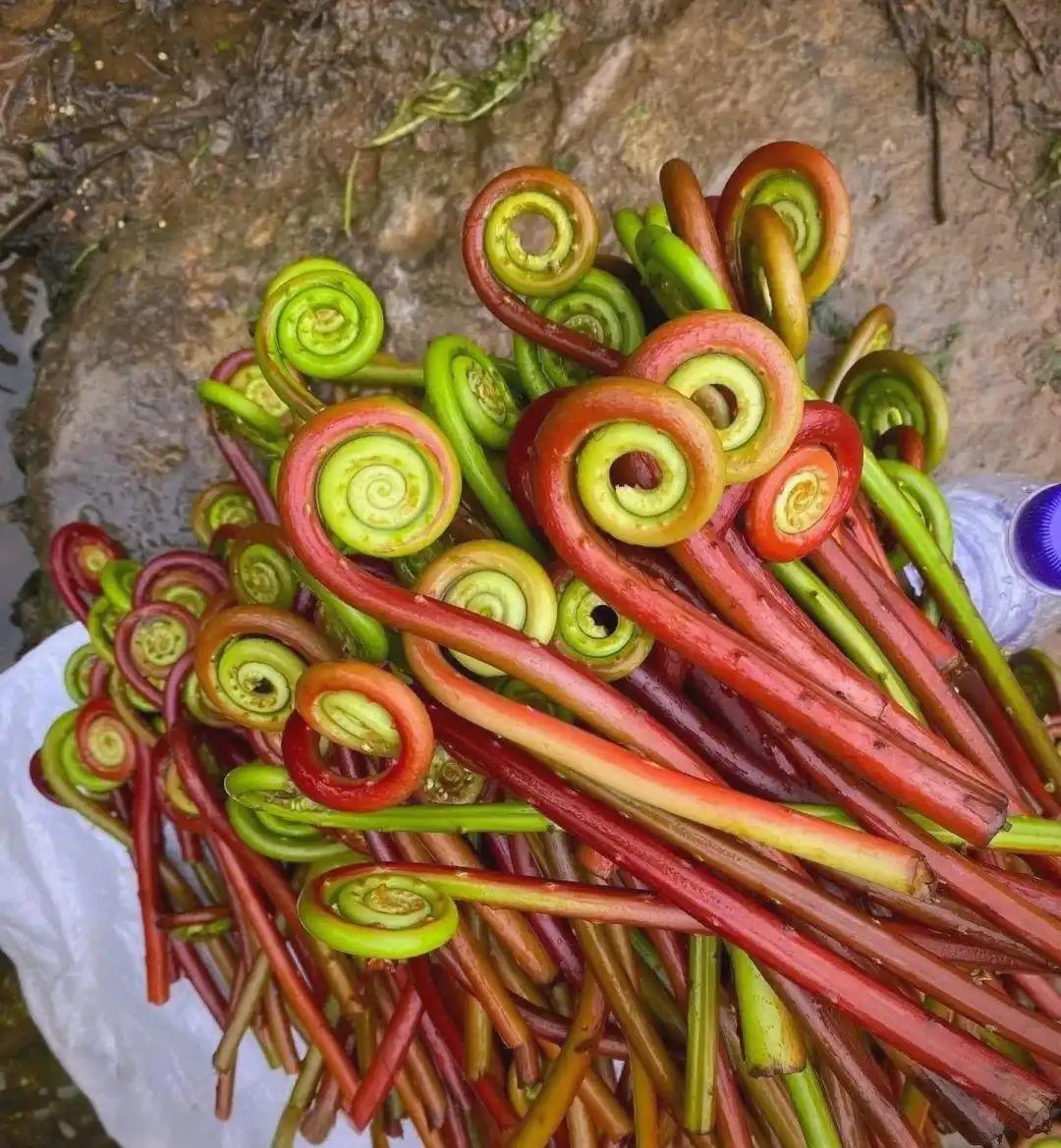 蕨菜主要生長在我國華北、西南的山區林地、荒坡或灌木叢中,初春時節破土而出,嫩莖翠綠挺拔,表面覆蓋着一層細密的絨毛,口感脆嫩爽口,自帶獨特的清香,被譽爲“山珍野菜”。注意:蕨菜需徹底煮熟後食用,避免生喫。