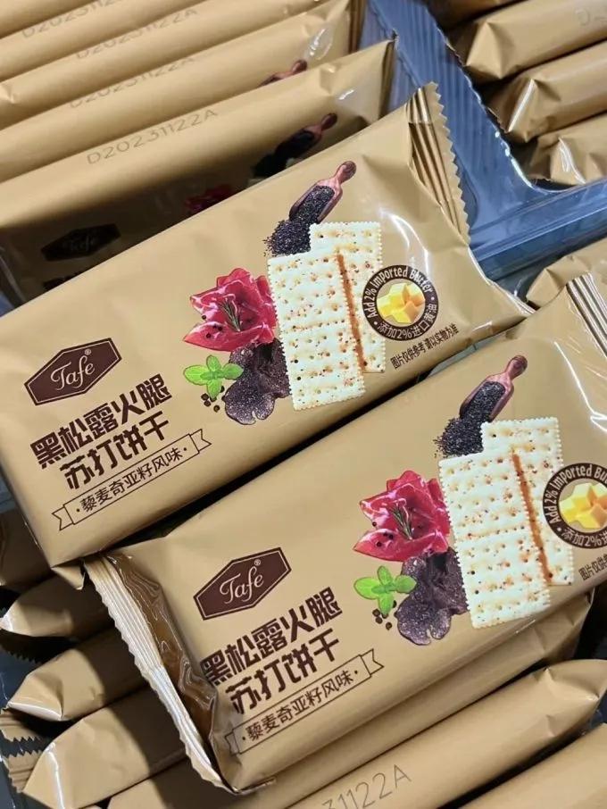 在零食的海洋裏,黑松露火腿蘇打餅乾是很多人的“心頭好”。39.9元40包,獨立小包裝方便攜帶。黑松露的鮮香混合着火腿的鹹香,酥脆得掉渣,卻一點都不油膩。這哪是餅乾,簡直是舌尖上的高級料理,下午茶配咖啡,瞬間提升格調。