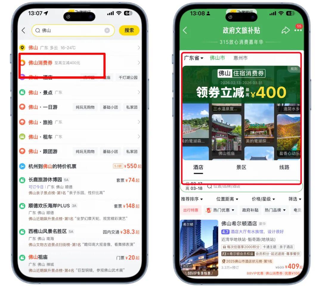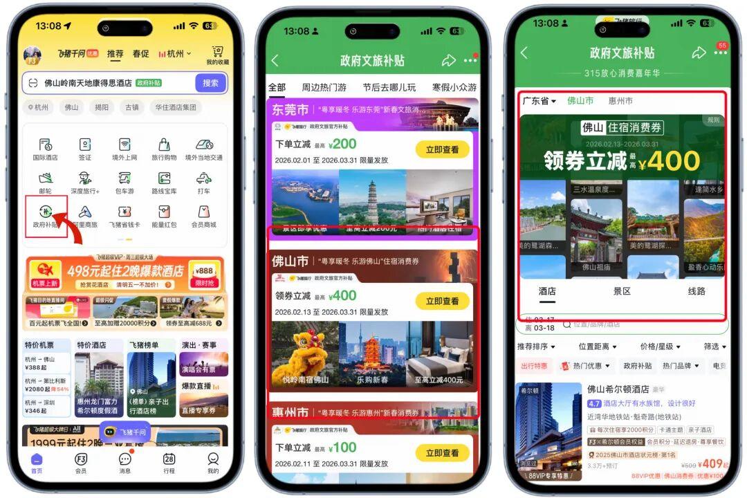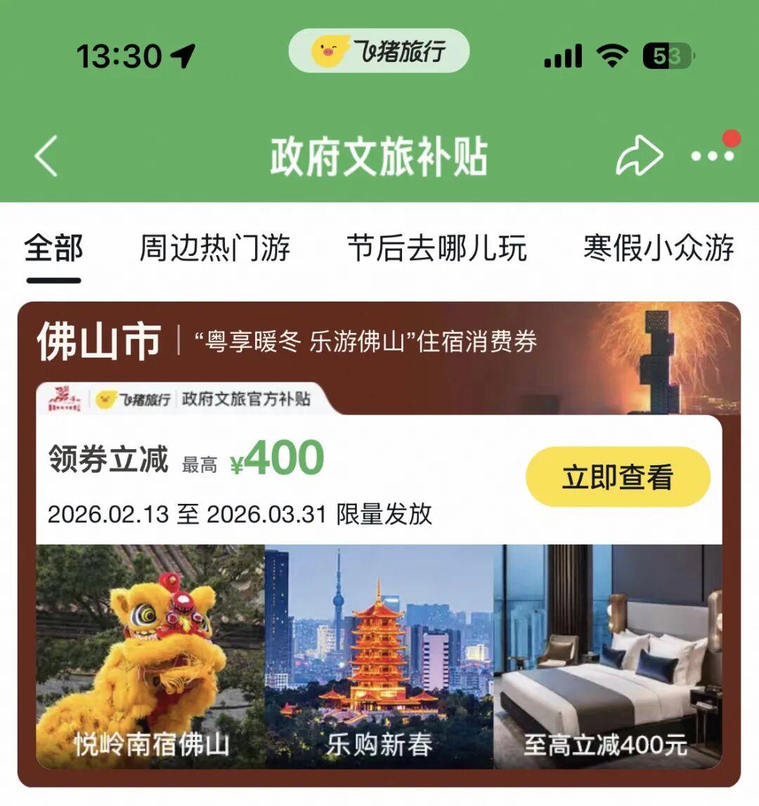 方式二:活動期間,打開飛豬旅行APP,點擊政府補貼頻道,查找進入“佛山消費券”專題頁面參與活動。
