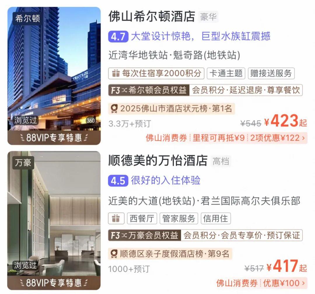 比如佛山希爾頓的基礎房、佛山嶺南天地康得思的基礎房、去年纔開業的順德美的萬怡城景房都只需要400出頭就能拿下,甚至還有集團的SNP。