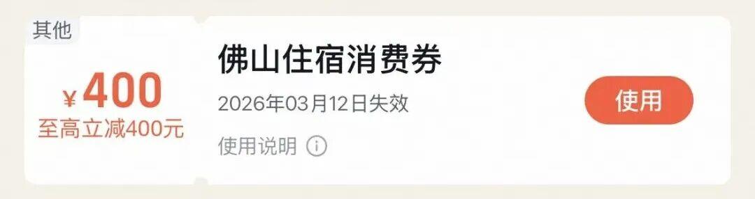 根據活動頁面提示有機會領取1張佛山的住宿消費券,用戶可享其中符合滿減金額最高一檔的優惠,滿500元立減100元,滿1000元立減200元,滿2000元立減400元。券數量有限,先到先得。