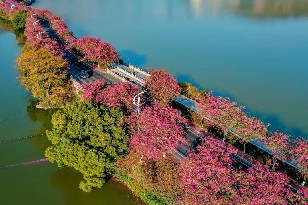 特別是七星巖宮,粉紫荊、櫻花、桃花、玉堂春、禾雀花集體盛放,粉色花廊+湖光山色,隨手出片。