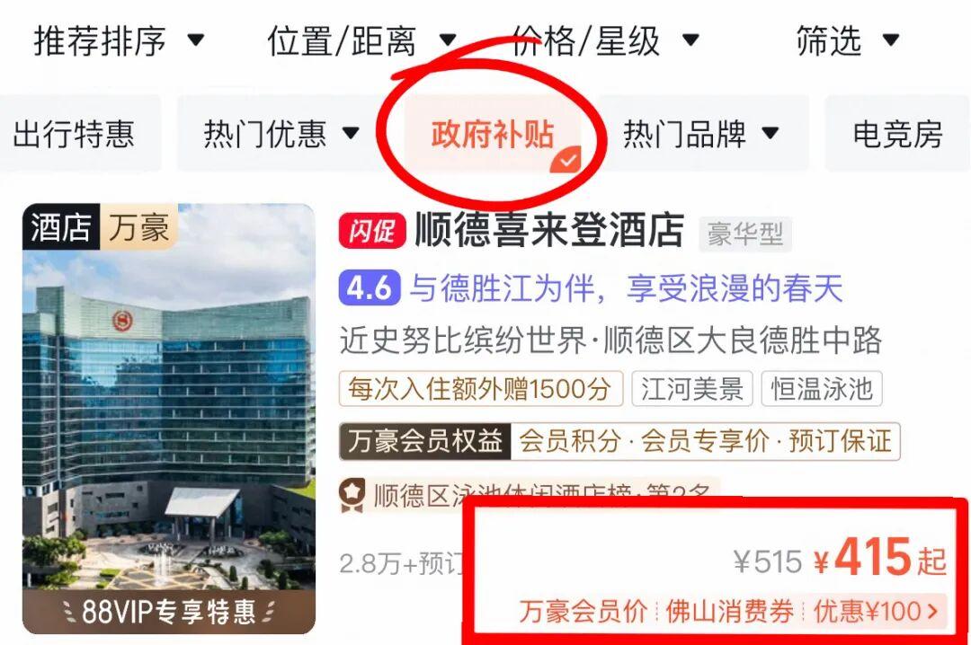 方式三:活動期間,打開飛豬旅行(包含飛豬旅行APP、飛豬微信小程序、支付寶端小程序、淘寶端小程序)等平臺渠道,搜索“佛山酒店”,可以直接篩選參與「政府補貼」的酒店。