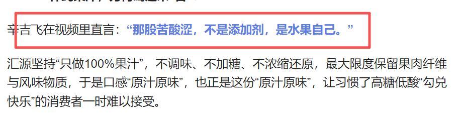 在這個勾兌果汁滿天飛的時代,匯源堅持做100%純果汁。哪怕經歷了退市、重組,哪怕被誤解,它依然死磕品質。之前匯源果汁因“零添加劑”被辛吉飛點名,他還說:“那股苦酸澀,不是添加劑,是水果自己。”