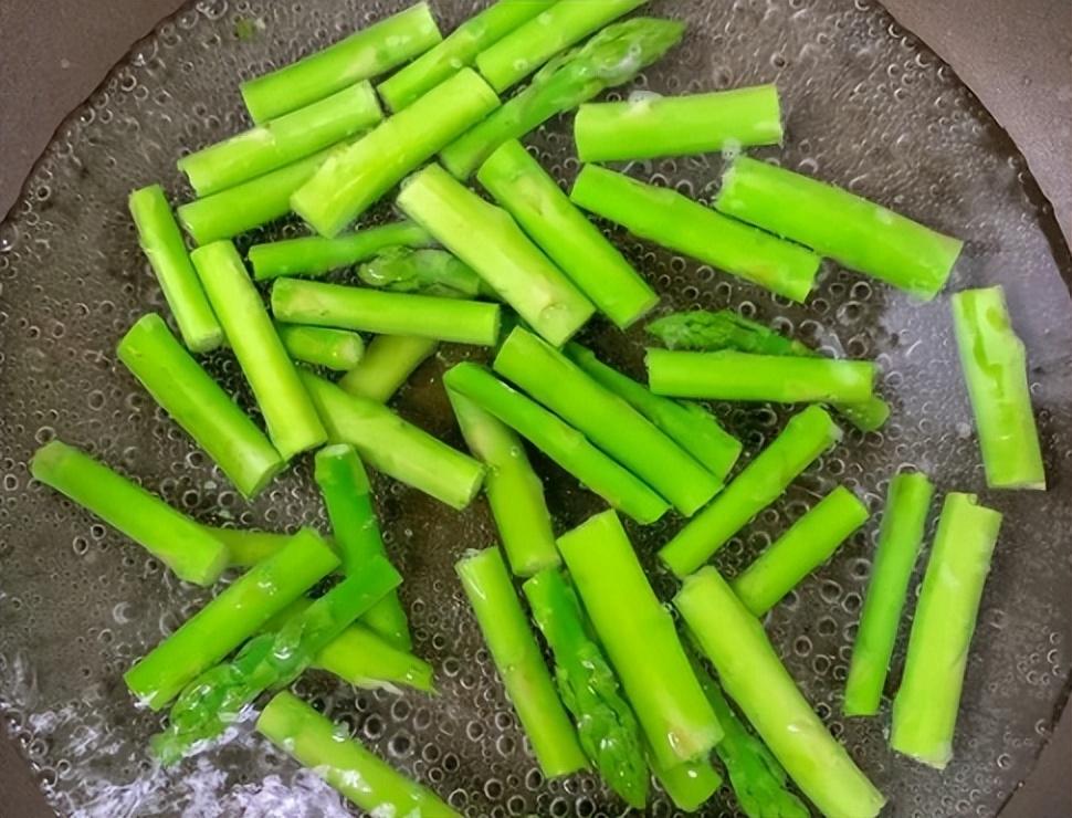 1、蘆筍清洗乾淨後切成小段,鍋裏水開放鹽和食用油,下入蘆筍,這也焯出的蘆筍顏色更加翠綠。