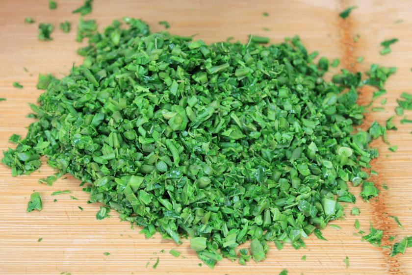 2、過涼之後我們把水分擠幹,接着我們先把香椿切碎,然後再繼續剁得碎一些,顆粒太大後面不好操作,剁好之後裝入碗中備用。