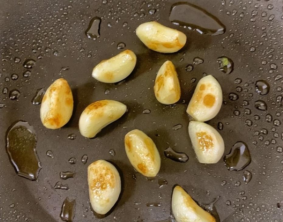 4、鍋裏留油,放一些大蒜,把大蒜煎到微微金黃,然後放入牛肉,蘆筍。