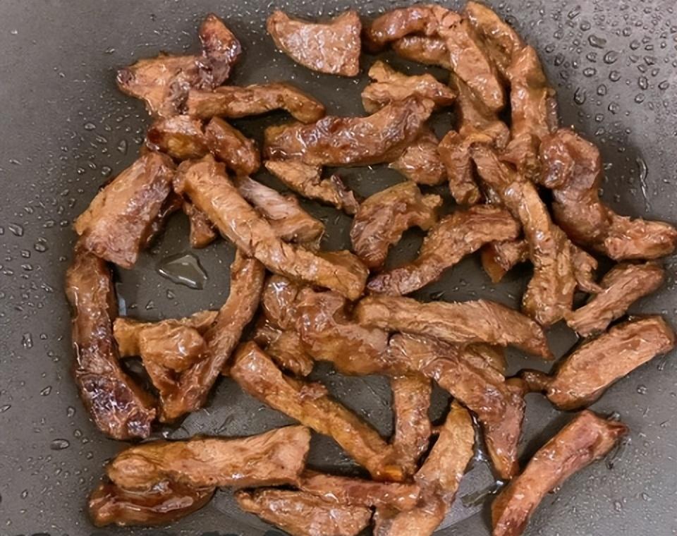 3、鍋裏來適量油,放入牛肉煸炒,炒到七八分熟盛出備用。