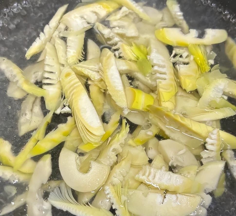 1、首先準備春筍切成片,鍋裏水開下午春筍焯水3-5分鐘。撈出過涼水;