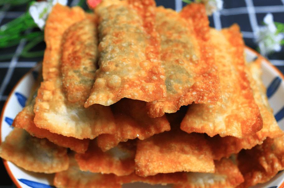 8、平底鍋裏倒入稍微多一些油,油溫5成熱時下入生胚,中小火慢煎,底部定型後,給它翻個面,翻的時候慢一些,因爲上面還是比較軟,比較容易破,一直開小火煎,要勤翻面,因爲餛飩皮比較薄,火大了容易焦,煎到餅鼓起來,兩面變得金黃酥脆,就可以關火裝盤了。