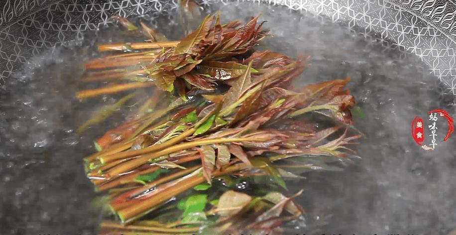 1、香椿洗乾淨後先把根部給它切掉,鍋裏水開後滴幾滴油,這樣焯出的香椿顏色翠綠,香椿一定要焯水,可以降低亞硝酸鹽的含量,香椿下鍋後,瞬間就會從紅色變成綠色,這是正常現象,並不影響它的口感,水再次煮開之後就可以撈出來了,時間不宜過長,撈出後過一下涼水。