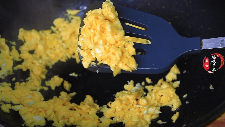 4、鍋裏多倒一些油,油熱之後倒入蛋液,把雞蛋炒熟,把雞蛋炒得稍微碎一些。