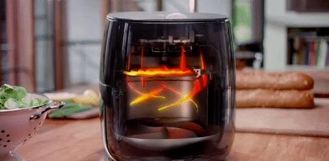 流行到現在已經有十多年了 ,它原理很簡單,有點類似於大號的吹風機,利用頂部加熱管+高速風扇,讓熱空氣在密閉小空間內快速循環,模擬油炸效果,靠熱風帶走食物表面水分,實現外脆裏嫩,可以實現無油甚至少油操作 。
