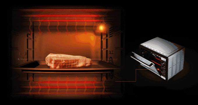 通過上下加熱管發熱,靠熱輻射加熱食物,密封性強,適合慢烤、烘焙,受熱均勻度優於空氣炸鍋,容量通常最大,一般在20L以上,有分臺式以及嵌入式。