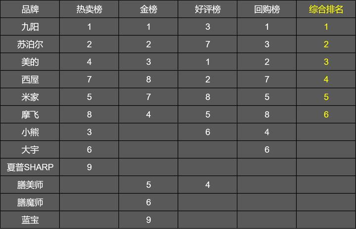 做了以下這個榜單統計,頭部依然是九蘇美三足鼎立,其次西屋、米家和摩飛緊跟其後,我們今天就來着重講講這幾個品牌: