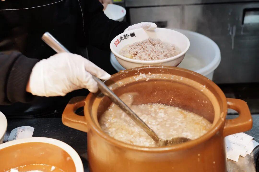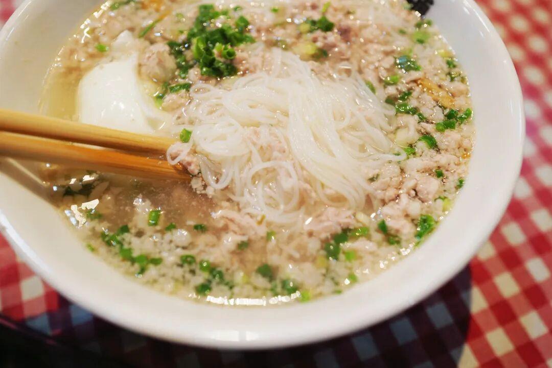 碎肉粉是鎮店招牌,10元。快速撈好粉裝碗,蓋上一大勺三分肥七分瘦的現剁豬肉臊子,最後澆上筒骨雞湯,料多到要滿出來了。
