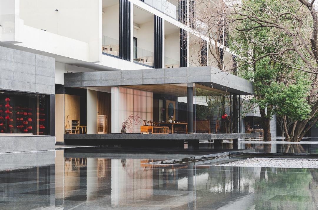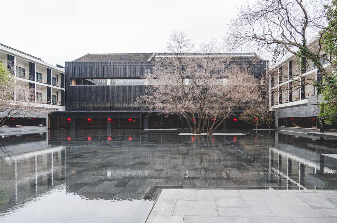 這裏是良壤的核心部分,沒有飛檐翹角,沒有假惺惺的仿古元素。就是四個極簡的深色方盒子,中間一汪水,幾棵古樹,以及一座原木色的亭子。