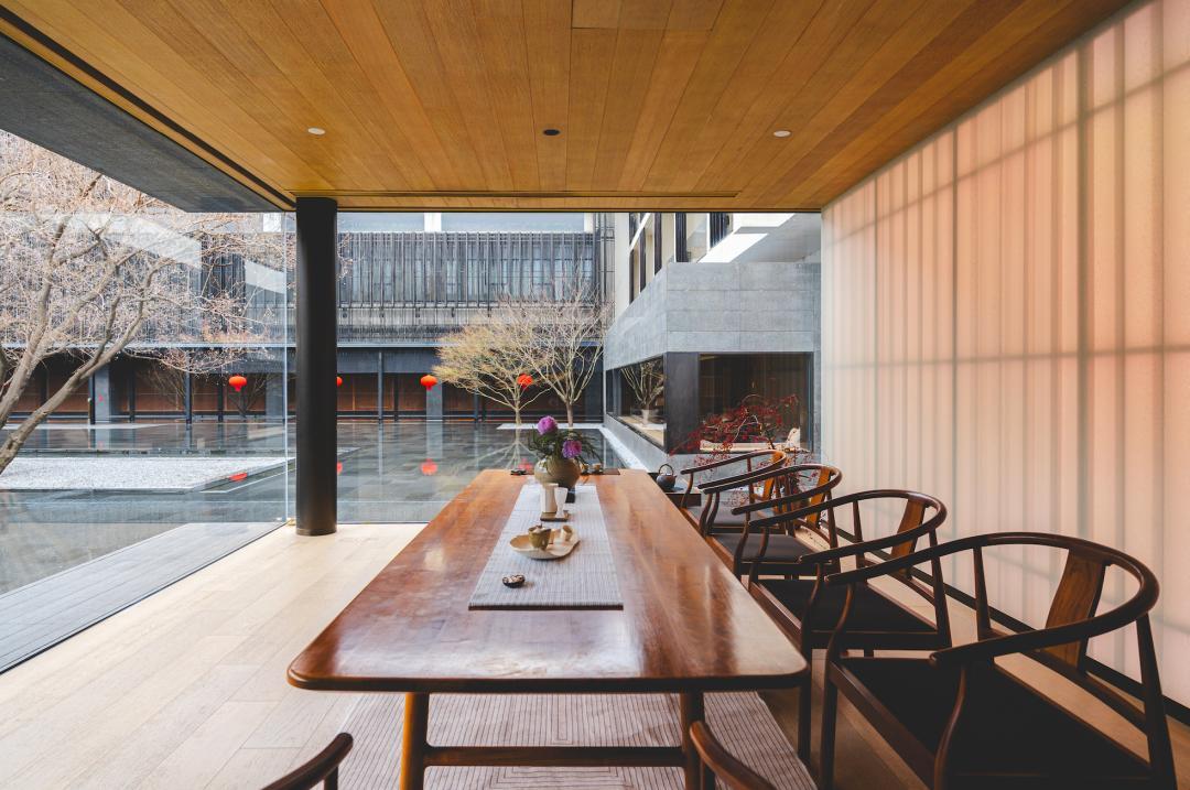 依納良庭水庭院而建,半開放式,窗外就是水和樹。