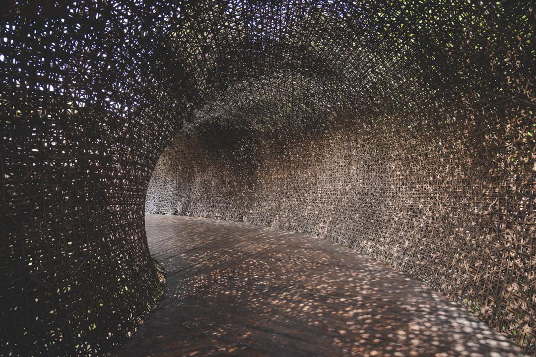 先過曲曲折折的竹編長廊。