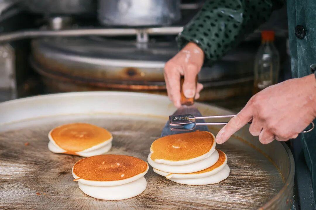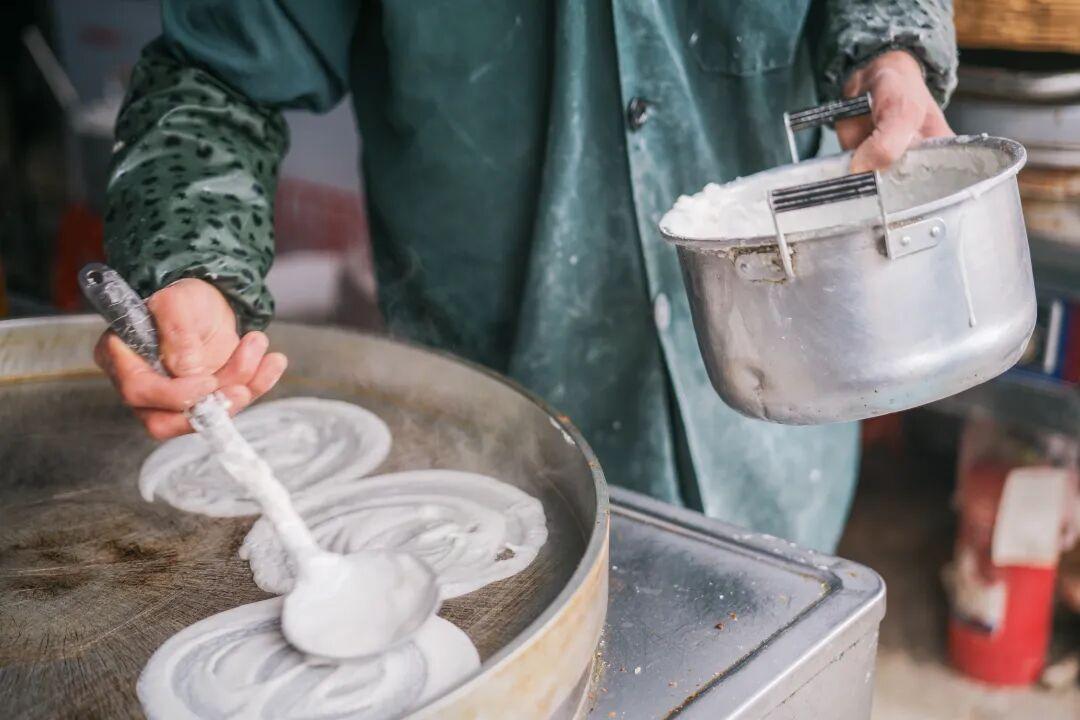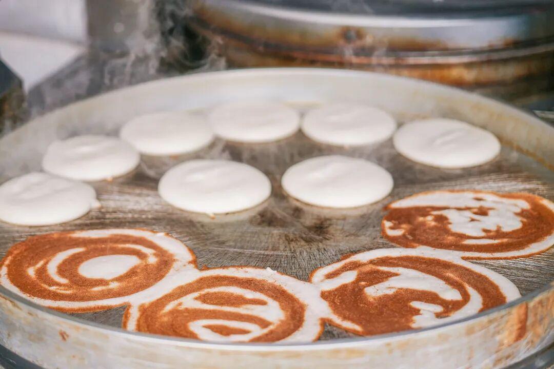 米飯餅有厚的和薄的兩種。厚的米飯餅長得跟舒芙蕾一樣,拿在手裏很Q彈,口感鬆軟微甜,微甜中夾雜着淡淡的酒釀味道,最經典的喫法是夾油條。