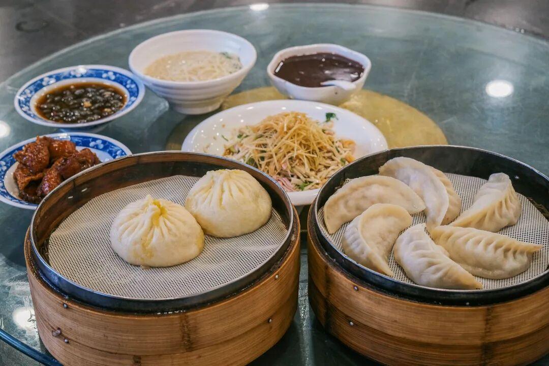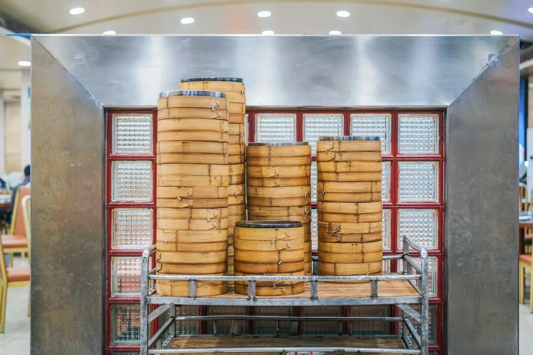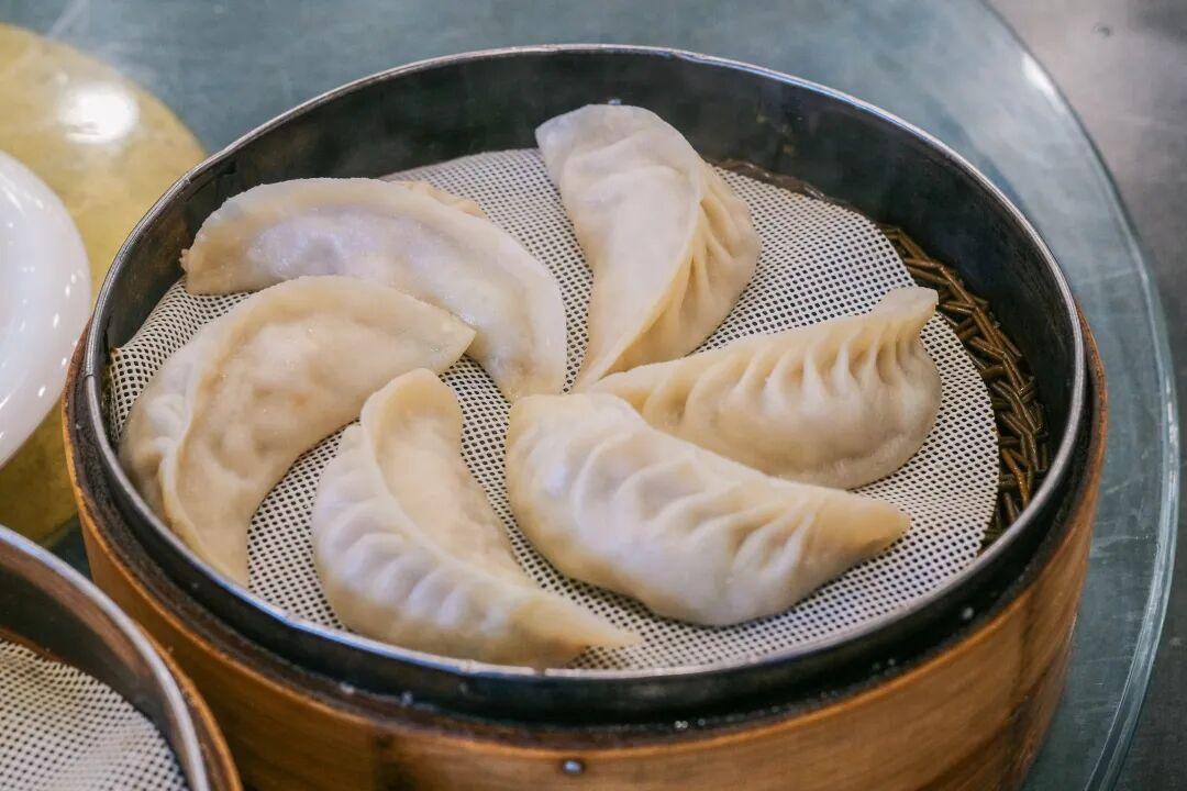 最先上桌的是蒸餃。籠屜足有臉盆大小,掀開蓋的瞬間,看到了滿滿一籠蒸餃,每一個都是普通餃子的四倍體量。個頭雖大,但麪皮很薄,被撐得半透明,隱約可見內裏粉紅的肉餡。