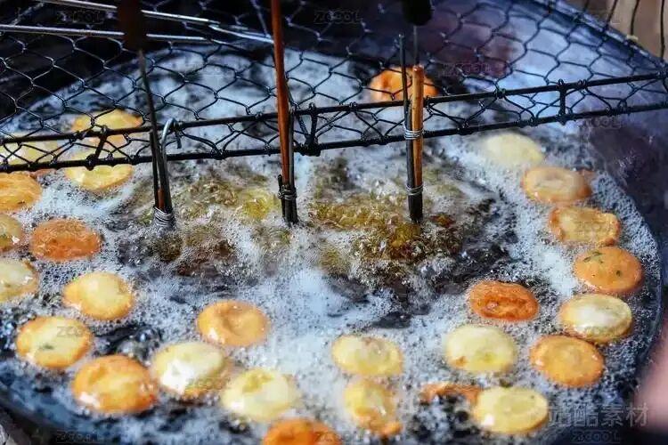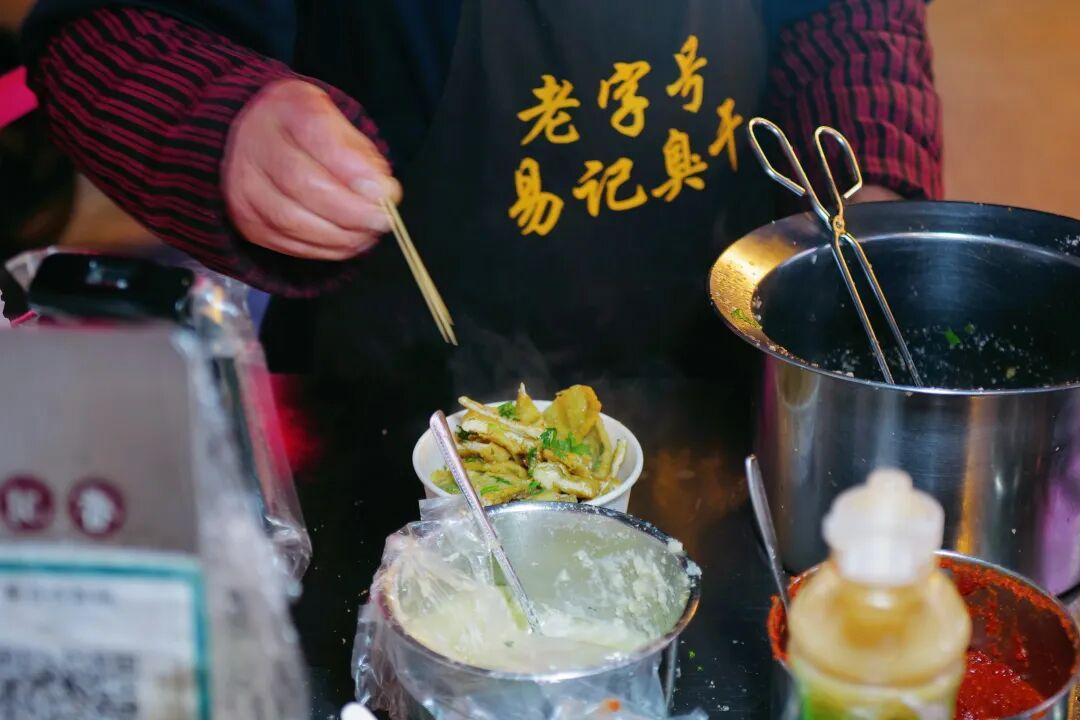 另一個熱門油炸攤賣的是炸臭幹。金黃的油花"滋啦"作響,剛出鍋的臭幹立刻拌上蒜水,香氣霸道。臭幹是薄薄的,喫起來也不膩人。