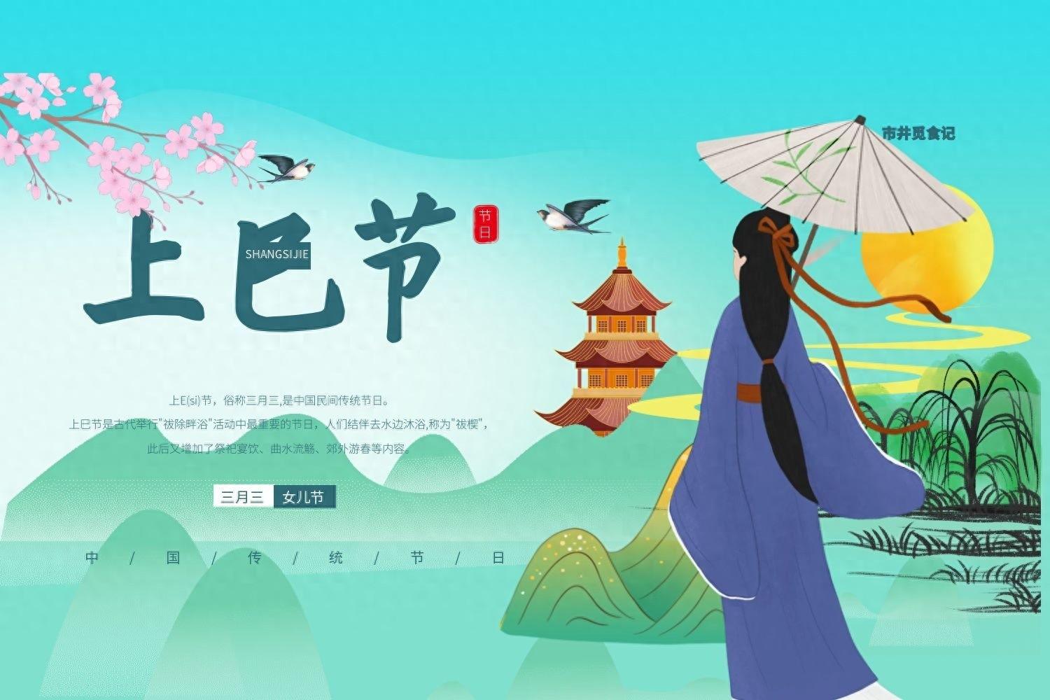 名稱由來:古代以干支紀日,三月上旬的第一個巳日稱爲 “上巳”,“上巳” 二字最早見於漢初文獻。魏晉以後,爲了方便傳承,節日日期固定爲農曆三月初三,因此也叫 “重三”“元巳”“女兒節”。