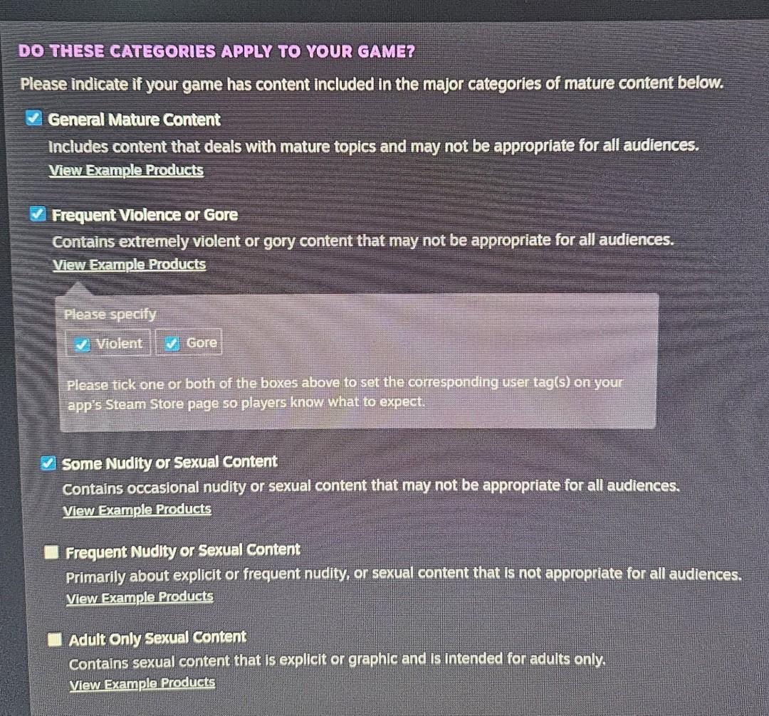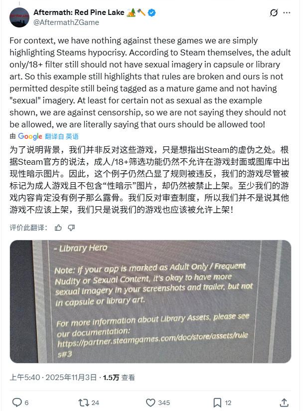 此外,根據Steam的相關規定(可參照Steamworks文檔),用於商店頁面或玩家庫中的展示圖片,其標準大致相當於電影的“PG-13”級別。即便是成人向(Adult Only)作品,也不能在封面或庫中展示含有裸露或明顯性暗示的內容。因此,就算本次《Aftermath Z: 紅松湖》以成人向標籤進行提交,其封面圖像依然會因同樣理由而無法通過審覈。
