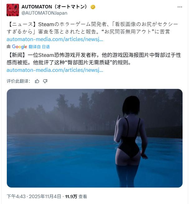 恐怖遊戲《Aftermath Z:紅松湖(Aftermath Z: Red Pine Lake)》的開發商櫻花工作室(Sakura Studios)宣佈,他們的這款遊戲未能通過Steam審覈,無法在商店頁上架。櫻花工作室表示,被拒的原因是橫版圖片中“臀部過於性感”而被拒。