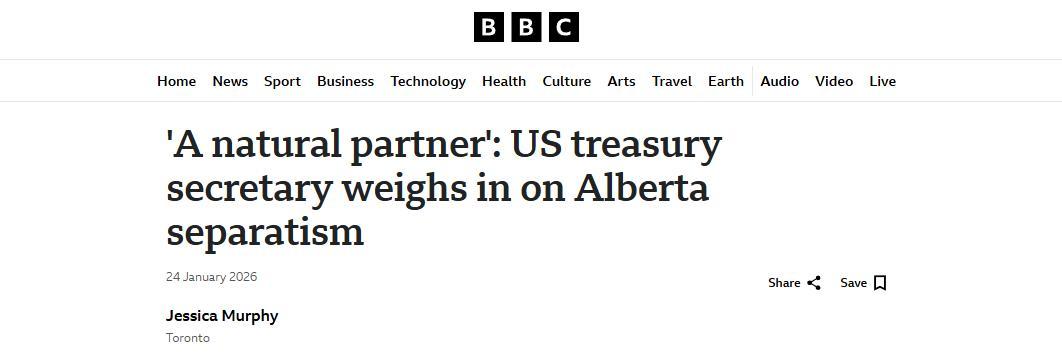 加拿大與美國接壤的艾伯塔省,好巧不巧就有分離組織正在收集簽名,準備獨立公投。美國財政部長斯科特·貝森特,更是毫不掩飾地歡迎他們來美國。並且提到了計劃修建的“輸油管道”,還強調加拿大自然資源豐富,是美國的天然合作伙伴。