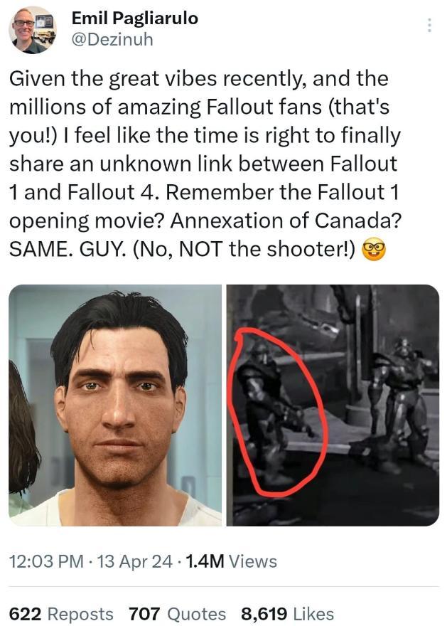 更黑色幽默的是,這個虐殺平民的大兵,真不一定只是背景。因爲,Bethesda的編劇Emil Pagliarulo曾自作聰明地向玩家暗示,《輻射4》與初代《輻射》的開場動畫,存在着密切聯繫——換句話說,《輻射4》的主角老冰棍,就是這名戰犯。