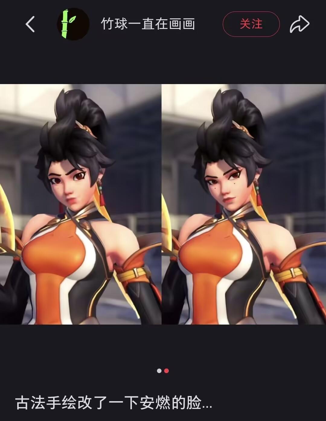 其實,在“安燃”角色形象公佈後,國內的《守望先鋒》社區,也產生了一些關於“安燃臉模要不要改得更英氣一些”的相關討論。就比如上面那個被拿來和“索尼克”聯繫的改圖,就出自小紅書用戶“竹球一直在畫畫”之手。