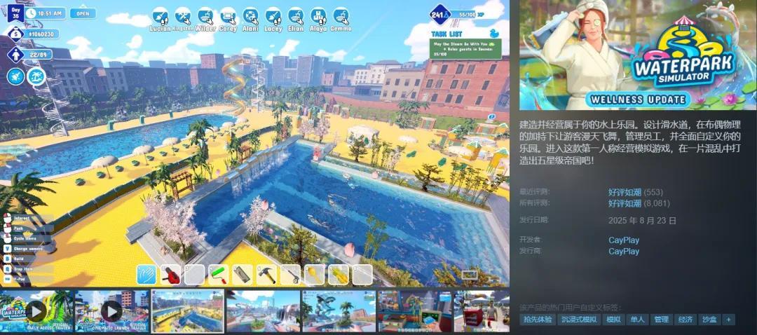 【短評】:正如其名一款非常有趣的水上樂園模擬器,模擬器愛好玩家必入。前二十多個小時根本停不下來,前期玩起來非常的忙,不過後期可以直接託管給員工,猛猛掛機刷任務刷錢。