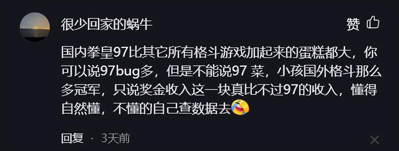 更有玩家調侃小孩在國際賽場的獎金,根本不如《拳皇97》在國內賽事的獎金豐厚。以此來說明小孩是《拳皇97》技術不夠才選擇逃避去參加世界格鬥遊戲大賽,並順便拿到世界冠軍的。間接說明只有國內的97賽事纔有含金量,國際賽事沒有什麼含金量。
