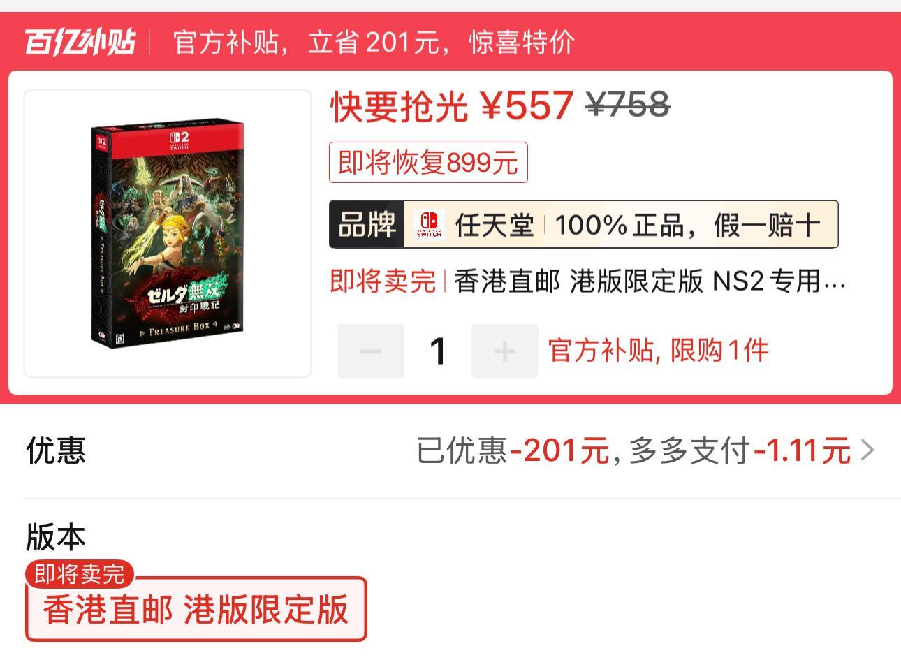 3.《塞爾達無雙:封印戰紀》NS2限定版577元全新包郵
