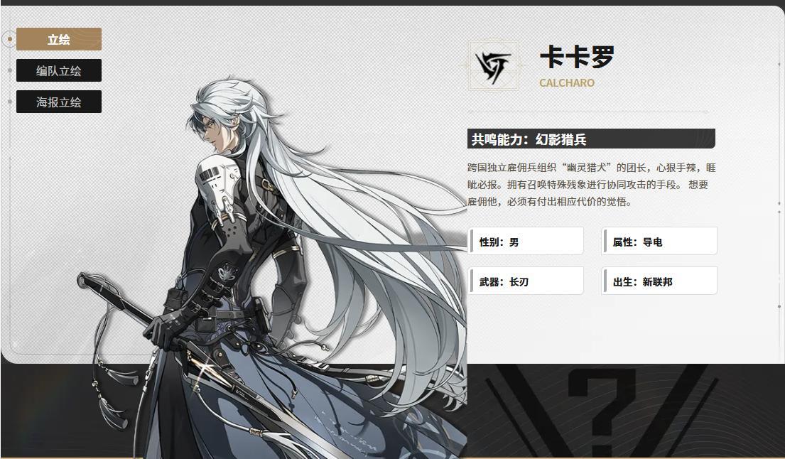 遊戲中還有如卡卡羅般有着豐富閱歷的成男形象。冷白色的長髮搭配頗具機械感的臂甲爲卡卡羅增添了冷冽的氣質,跨國獨立僱傭兵組織“幽靈獵犬”的團長的身份也讓他有着超乎常人的洞察力。心狠手辣、睚眥必報的性格下,是強烈的自我意識,複雜而冷酷的設定吸引了相當多玩家的目光。