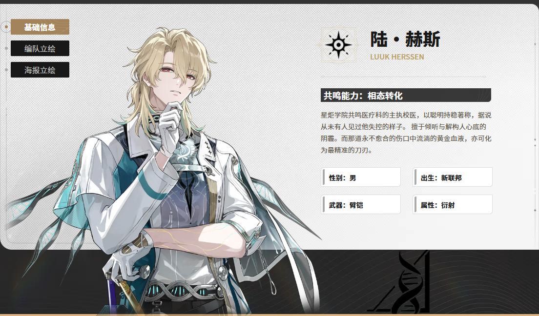 實際效果來說,陸·赫斯的服裝明顯有着“白大褂”元素,直筒白色袖口上增添藍色圓環,單側披肩與假雙袖的設計使用透明材質布料,都與星炬學院的高科技感相匹配。單手袖口挽至手肘,兩個主要立繪手中分別拿着試管和記事板,與醫生形象高度匹配。