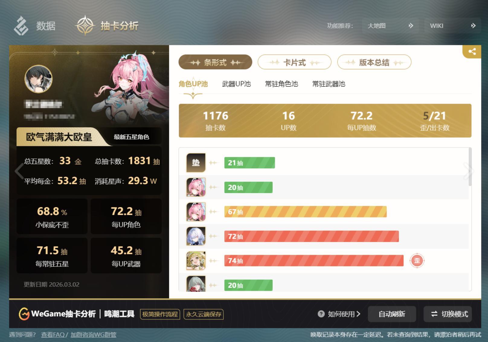 在3.2版本這種單新UP搭配多復刻的卡池結構中,科學評估自己的資源儲備,從而在西格莉卡、仇遠和下半卡池的菲比之間做出最合理的選擇,避免因信息不清打亂抽卡計劃,是非常有必要的。WeGame的助手頁功能不但能滿足這一項需求,還能在遊戲內一鍵刷新抽卡分析結果,體驗感相當不錯。