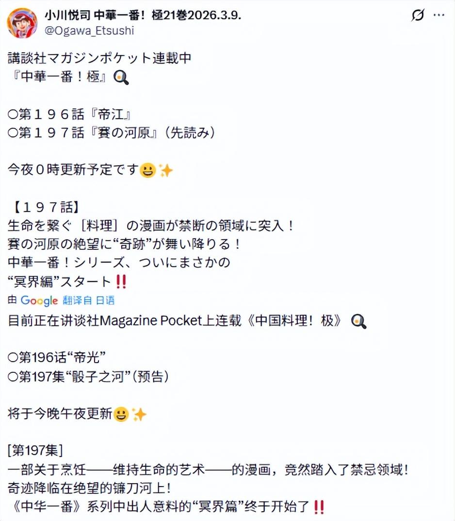 而從冥界篇的劇情展開來講,《中華小當家!極》的後續劇情發展大概率不會出現太多問題。倒不如說,不少文化作品中都有主角進入冥界歷練,提升戰力後再度歸來的橋段。哪怕小川悅司實在不會構思劇情,也能照着其他作品的公式來寫。