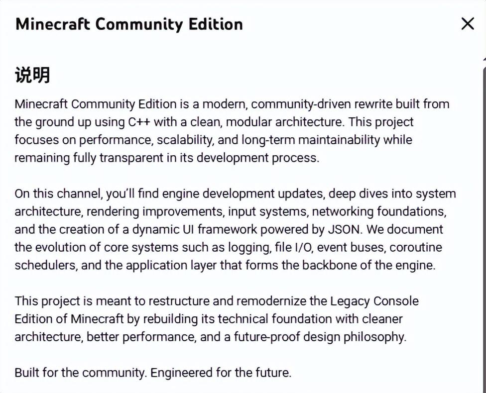 他們使用了這次泄露事件中的原主機版代碼,想要把官方踢開,建立一個不屬於官方的“他們的世界”——這個世界,正是專門爲了社區打造的。也就是說,每個人都可以爲這個項目添磚加瓦,甚至比原本就很開放的JAVA版都自由,屬於是感謝X聖開源了。