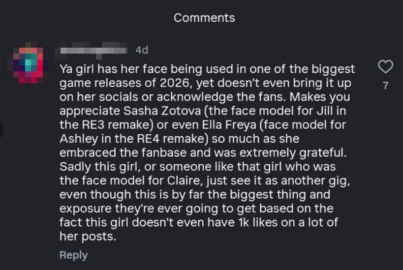 接着,批評者又開始列舉以往曾擔當過系列作品的臉模,比如《生化危機3重製版》女主角吉爾的臉模Sasha Zotova,以及《生化危機4 重製版》女主角艾什莉的臉模Ella Freya,並表示她們就相當積極地與遊戲粉絲互動,還對出演遊戲表現出感激之情。
