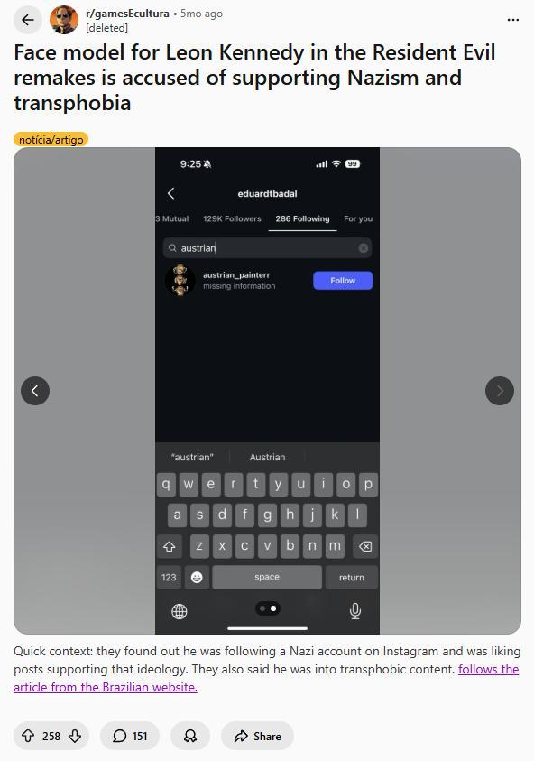 隨後,在2023年的《生化危機4 重製版》發售後,由於Eduard Badaluta依舊擔任里昂臉模,再加上該作獲得了更多的熱度,透過里昂而愛上Eduard Badaluta的人也越來越多。